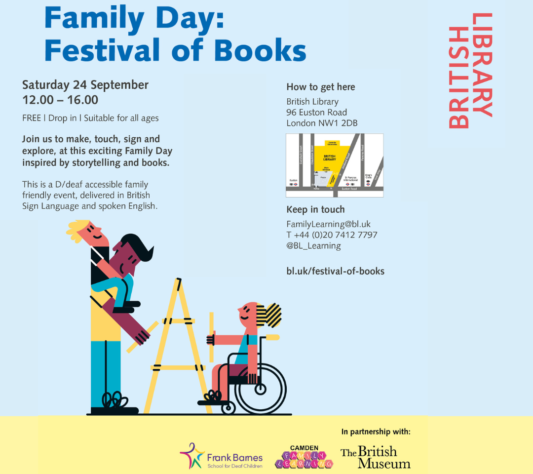 British Library is organising a Family Day: Festival of Books on 24 September from 12.00 - 16.00. Join them for this fun-filled day inspired by books and learning. It's a free, drop in and D/deaf-accessible family friendly event, delivered in British Sign Language and spoken English.